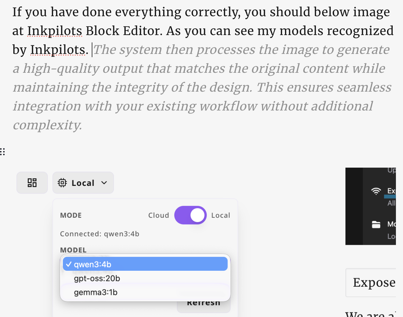 Hi there, Did you know Inkpilots Block Editor can connect your local Ollama instance for text generation ? It does. We are going to talk about it and how can you benefit from it. This integration allows for seamless text generation directly within your local environment, enhancing privacy and reducing latency. By leveraging Ollama's lightweight models, you can achieve faster response times while maintaining control over your data. Most important part is it is totally free since models works on your computer. This means you can generate text without relying on external services or internet connections, keeping your data completely private. Whether you're writing, coding, or creating content, this integration provides a secure and efficient way to work with AI models right at your fingertips.